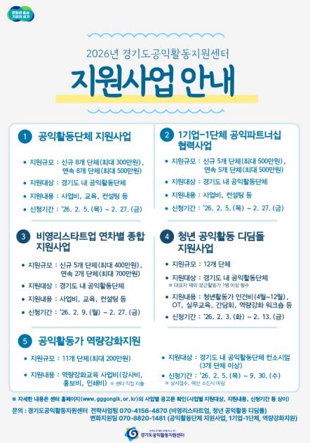 [뉴스서치] 경기도공익활동지원센터가 ‘2026년 경기도 공익활동 지원사업’에 참여할 도내 공익활동 단체를 모집한다.