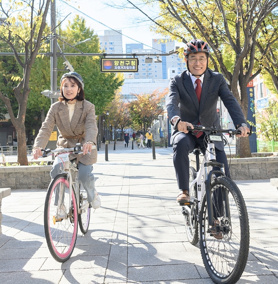 ▲ 구민과 자전거 시승중인 이기재 양천구청장 |