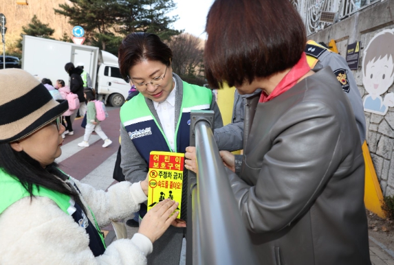 ▲ 학교 앞 방호울타리 포인트 존에서 스티커 부착 중인 김미경 은평구청장(가운데) 모습. |