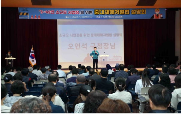 [뉴스서치] 도봉구가 4월 18일 구청 선인봉홀에서 5인 이상 50인 미만 소규모 사업장 사업주 및 관계자 약 230여 명이 참석한 가운데 중대재해처벌법 설명회를 개최했다.