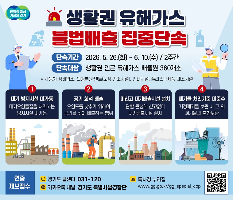 [뉴스서치] 경기도 특별사법경찰단이 5월 26일부터 6월 10일까지 2주간 주거지·학교·병원 등 생활권 인근 지역의 유해가스 배출 사업장을 대상으로 불법행위를 집중단속 한다.
