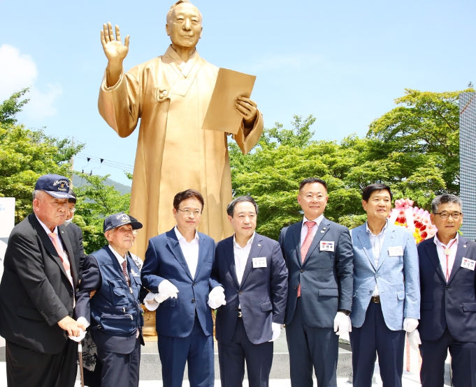 ▲ 지난해 7월 이승만 전 대통령 동상 제막식에 참석한 김재욱(오른쪽 3번째) 칠곡군수가 이철우 경북도지사를 비롯한 주요 내빈과 기념 촬영을 하고 있다. |