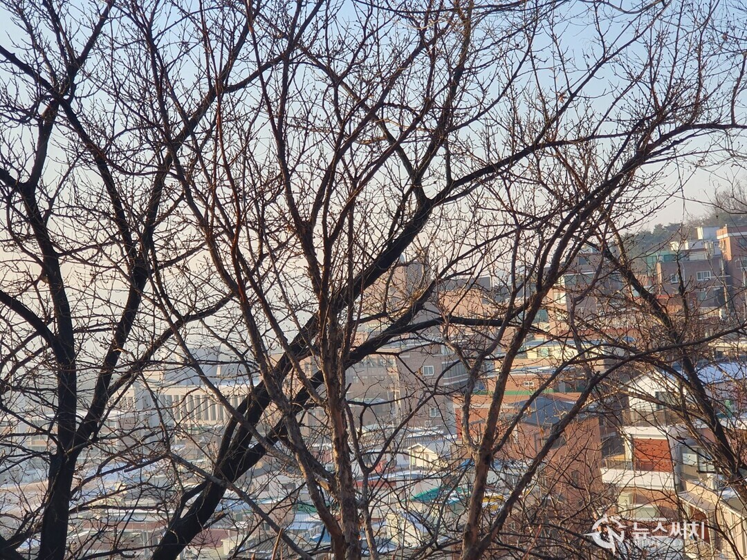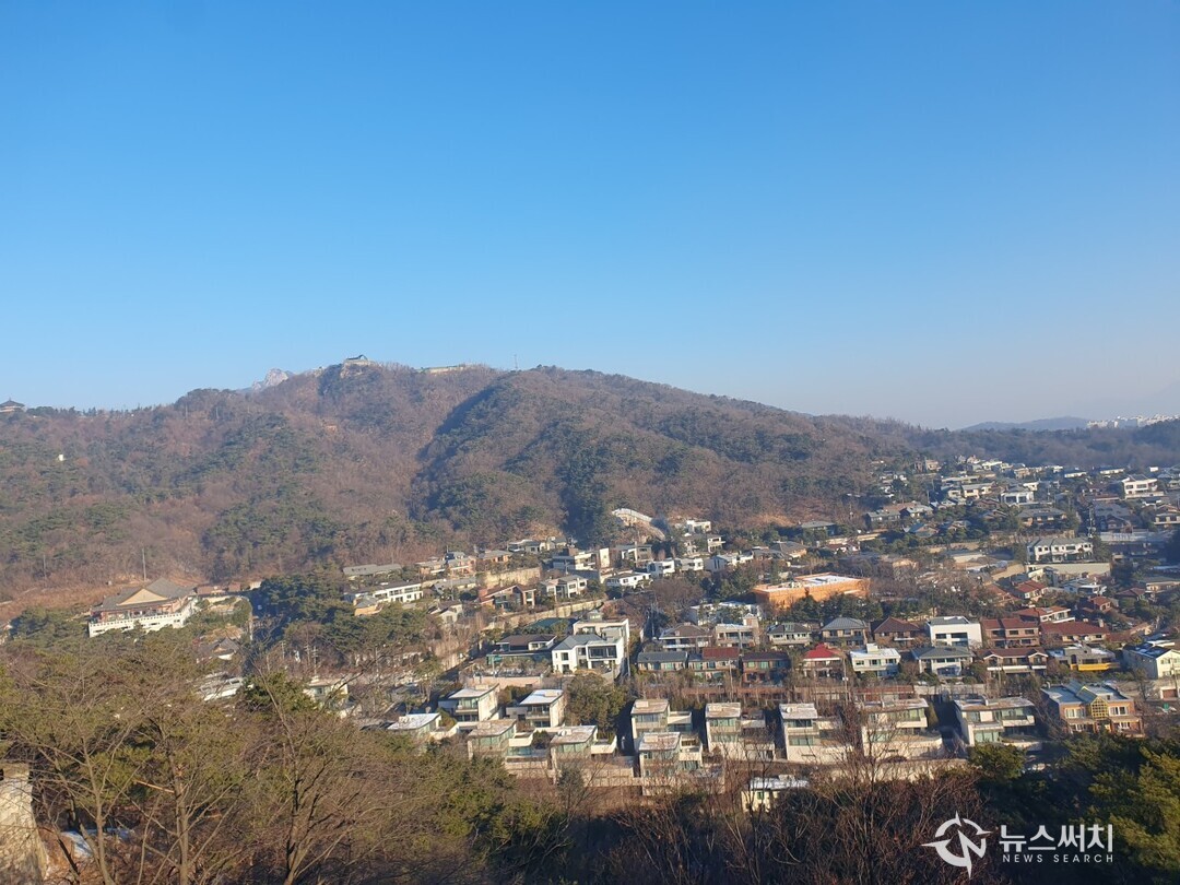 그곳에서 필자는 오전 9시 23분 다시 한양도성 성벽을 넘어 도성 안으로 진입할 수 있도록 성벽에 설치된 나무계단을 넘었다. 나무계단 정상부는 전망대 역할도 겸하고 있었는데 성북동 일대가 한눈에 조망되었다.