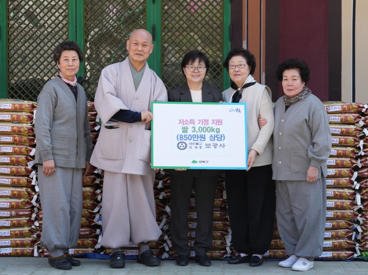 이순희 강북구청장은 “어려운 상황으로 힘든 관내 저소득 구민들을 위해 지속적인 나눔을 실천하고 있는 보광사에게 감사드리고, 사랑의 쌀은 저소득 가정들에게 잘 전달하겠다”고 말했다.
