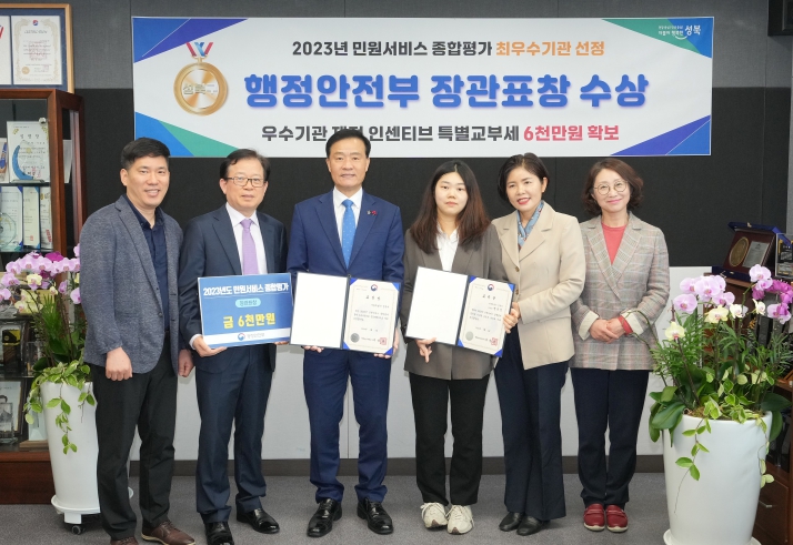 [뉴스서치] 서울 성북구가 ‘2023년 민원서비스 종합평가’에서 행정안전부 장관상을 수상했다고 16일 밝혔다. 이와 더불어 수상과 함께 재정 인센티브로 특별교부세 6천만 원도 확보했다.