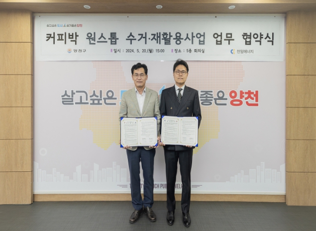 [뉴스서치] 양천구는 ㈜천일에너지와 ‘커피박 재활용사업 업무협약’을 체결하고, 서울시 자치구 최초로 모바일 플랫폼을 활용한 커피박 배출 신고부터 무상 방문 수거, 재활용까지 원스톱 처리 시스템을 구축했다고 밝혔다.