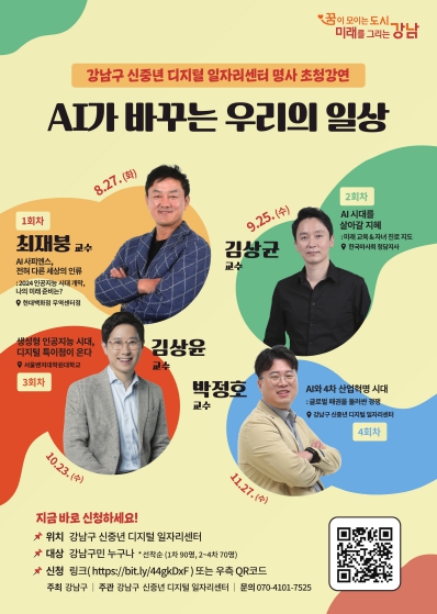 [뉴스서치] 꿈이 모이는 도시, 미래를 그리는 강남구는 신중년 디지털 일자리센터 주관으로 8월 27일부터 11월 27일까지 매달 한 번씩, 총 4회에 걸쳐 ‘AI가 바꾸는 우리의 일상’을 주제로 한 명사 초청 특강을 개최한다.