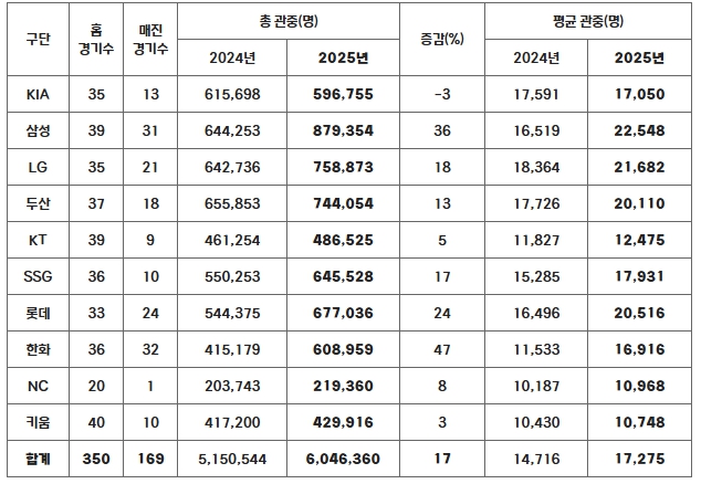 ▲ 2025년 구단별 관중 현황(2024-2025 홈 경기수 비교) |