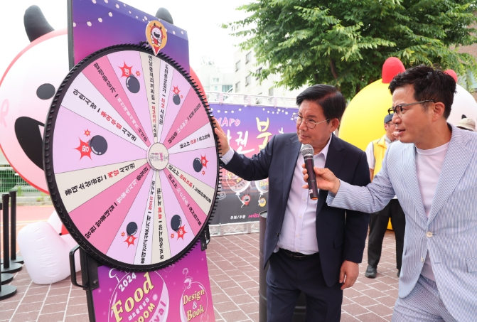 ▲ 박강수 마포구청장이 마포골목상권 붐 축제 '행운을 잡아라' 행사에 참여해 룰렛을 돌리고 있다 |