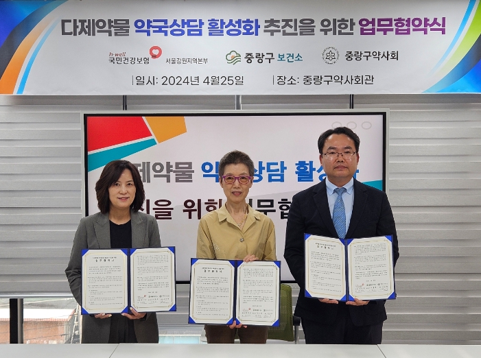 [뉴스서치] 중랑구 보건소가 지난 25일, 국민건강보험공단 서울강원지역본부, 중랑구약사회와 함께 다제약물 관리사업 관련 상호협력 업무 협약을 체결했다.