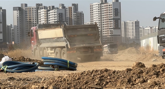 ▲비(B) 업체는 인적이 뜸한 도심 외곽지역에서 토목공사를 시행하면서 수송 차량이 세륜을 실시하지 않아 도로에 비산먼지를 다량 발생시켰다.