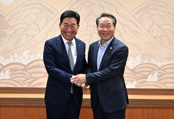 ▲ 유정복시장이 박종범 세계한인경제무역협회 회장을 만나(25.7.25) 10월 개최되는 세계한인인경제인대회 추진 상황을 점검하고 있다