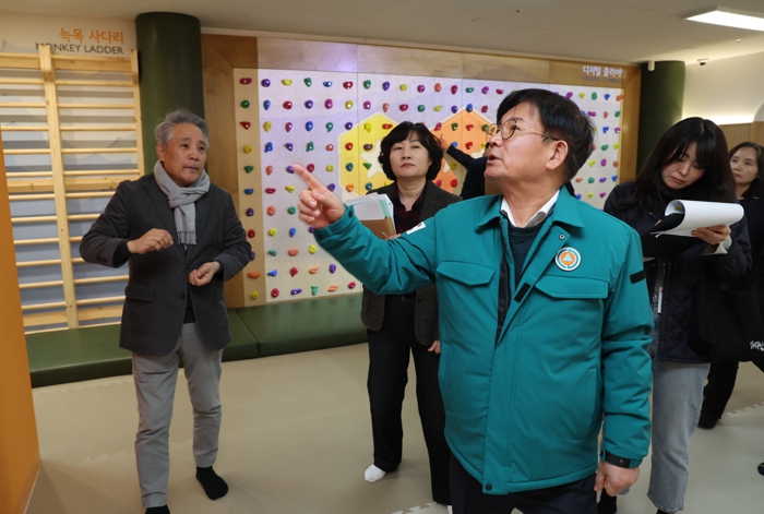 ▲ 마포 누구나운동센터에 설치된 시설물을 점검하고 있는 박강수 마포구청장 |