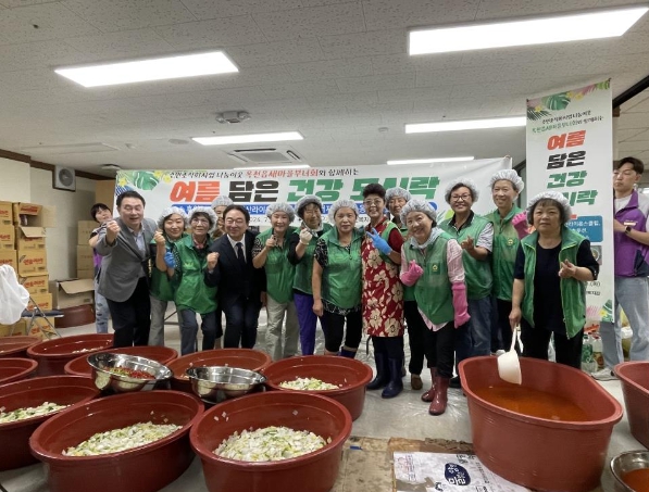 옥천읍 새마을부녀회 15명의 회원이 직접 재료를 손질해 나박김치, 오이무침 등을 만들고, 행복나눔푸드뱅크마켓이 라면 번들 150인분을 후원했다.