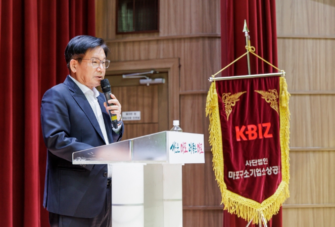 ▲ 지난해 4월 마포구 소기업소상공인 출범식에 참석해 축사를 전하는 박강수 마포구청장 |