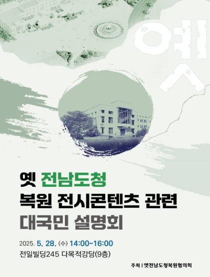 [뉴스서치] 문화체육관광부 옛전남도청복원추진단과 광주광역시, 옛전남도청복원범시도민대책위로 구성된 옛전남도청복원협의회는 5월 28일 오후 2시, 전일빌딩245(9층 다목적강당)에서 ‘옛 전남도청 복원 전시콘텐츠 관련 대국민 설명회’를 개최한다.