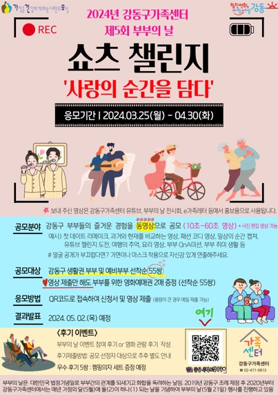 ‘제5회 부부의 날’을 기념해 강동구 부부들의 소중한 순간을 60초 이내 영상으로 공모하는 ‘쇼츠 챌린지’를 진행한다. 챌린지에 참여한 선착순 55쌍의 부부에게는 영화예매권 2매를 증정할 계획이다.