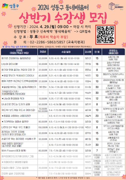 올해 상반기 프로그램 수강을 원하는 주민은 오는 4월 29일 월요일 오전 9시부터 성동구청 누리집 신속예약 페이지를 통해 선착순으로 신청할 수 있다. 동네배움터 프로그램 수강료는 전액 무료이며, 교재 및 재료비는 학습자가 부담한다. 자세한 사항은 성동구 평생학습관 누리집을 참고하면 된다.