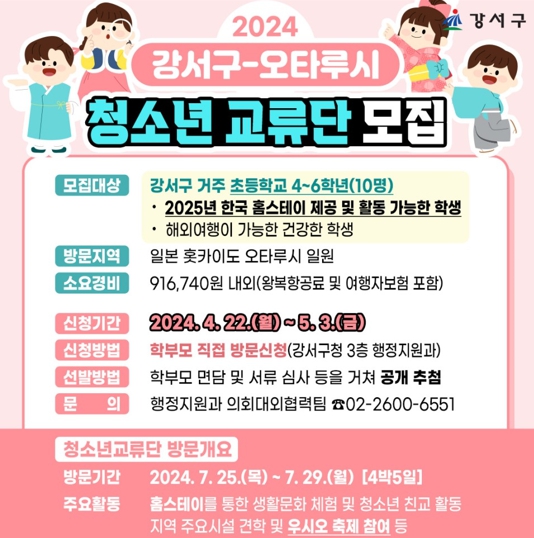 [뉴스서치] 서울 강서구는 여름방학 자매도시인 일본 오타루시를 방문해 현지 청소년들과 일본 문화를 체험할 ‘청소년교류단’을 모집한다.