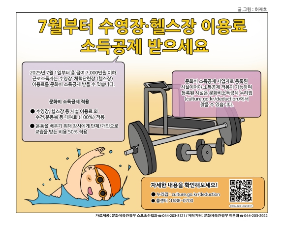 [뉴스서치] 문화체육관광부는 7월부터 시행되는 ‘체육시설 이용료 소득공제’의 적용 대상이 기존의 체력단련장업 및 수영장업에서 공공체육시설과 종합체육시설업까지 확대된다고 밝혔다.