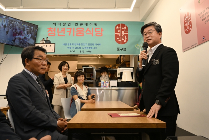 ▲ 청년키움식당에서 김길성 중구청장이 인사하고 있다 |