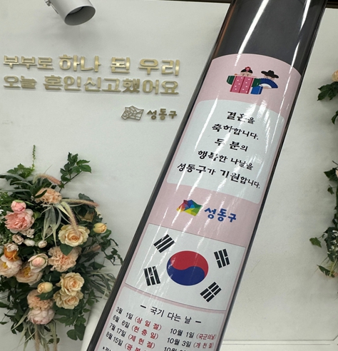 정원오 성동구청장은 "혼인으로 이어진 소중한 인연이 태극기에 담긴 뜻과 같이 서로 화합하고 조화를 이루어 행복한 가정을 꾸려 나가시기를 기원한다"라고 말했다.
