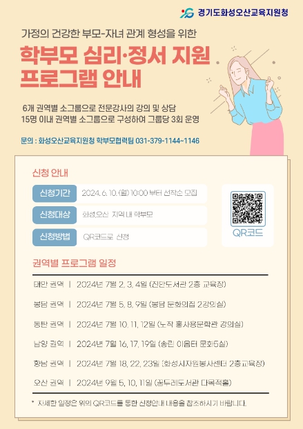 [뉴스서치] 화성오산교육지원청은 오는 7월부터 9월까지 관내 학부모를 대상으로 심리·정서 지원 프로그램을 운영하며, 이에 참여할 학부모를 선착순으로 모집한다.