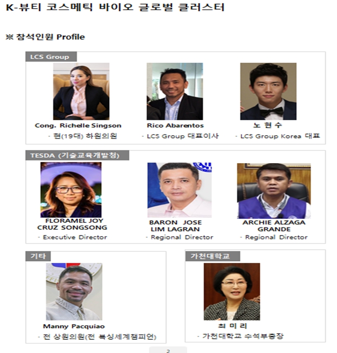LCS그룹 측에서는 샤빗 싱손회장외에도 현재 필리핀 19대 하원의원이면서 LCS그룹의 부회장을 맡고 있는 Richelle Singson(리셸 싱손), Rico Abarentos(리코 어바레인토즈) 대표이사 등 경영진들과 연구 개발 협력방안 모색을 위한 필리핀 기술교육청(TESDA)의 차관, 본부장등 8명이 참석했다.