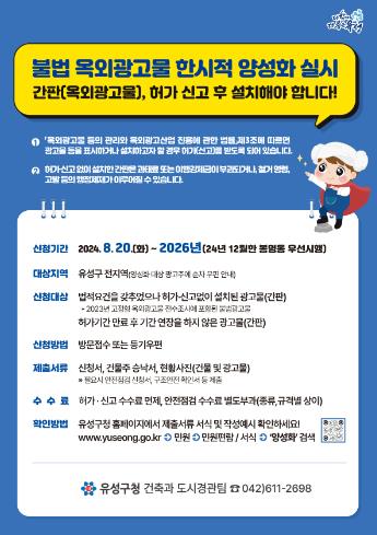 정용래 유성구청장은 “이번 양성화 사업을 통해 불법 광고물을 제도권 내에서 체계적으로 관리할 수 있게 될 것”이라며 “지속적인 단속을 통해 도시 경관을 개선하는 데 최선을 다하겠다”고 말했다.