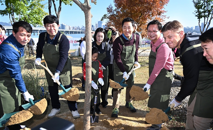 오 시장은 “14년 전부터 한강르네상스를 시작하면서 나무를 열심히 심기 시작해 한강변에 현재 371만 그루가 있는데 곧 심게 될 1만 그루를 더 해 오늘 372만 그루가 되는 날”이라며 “집에서 나와 5분, 10분 거리에 만날 수 있는 정원과 공원 많이 만들어서 생활 속에서 늘 걸으면서 몸 건강, 마음 건강 챙길 수 있는 ‘건강한 서울’ 만들기 위해 노력하겠다” 말하고 식수했다.