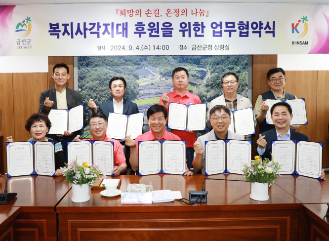 [뉴스서치] 금산군은 지난 4일 군청 상황실에서 관내 복지사각지대 해소를 위해 13개 후원업체와 업무협약을 체결했다.