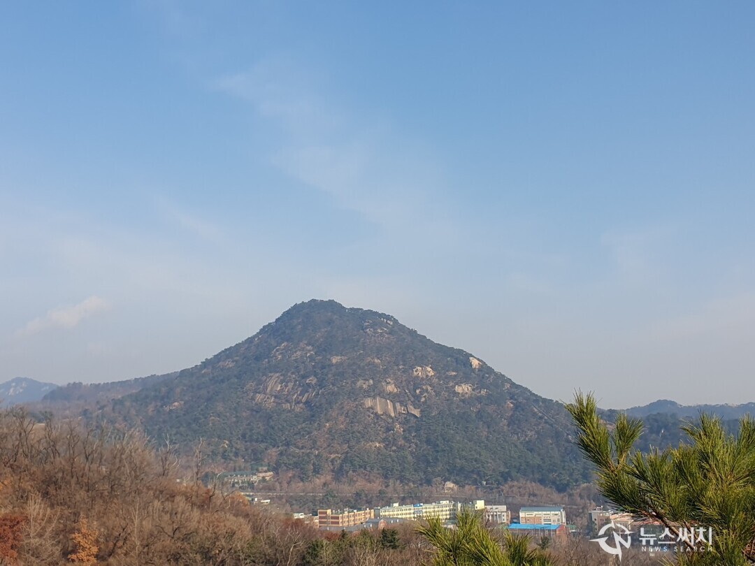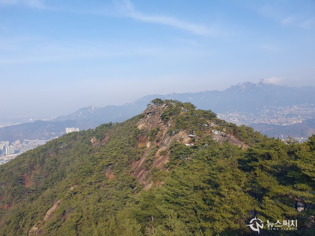 인왕산 중턱에서 바라본 북악산. 인왕산의 북동쪽에 한양도성의 진산 ‘북악산’이 위치해 있다. ‘북악산’은 청와대 뒷산으로 예전에는 출입이 제한되었다가 지금은 대통령실이 용산으로 이전되어서 대부분 출입제한이 해제되었다. 인왕산에서는 정상에서 뿐만 아니라 중턱에서도 북악산이 가까이 조망된다. |