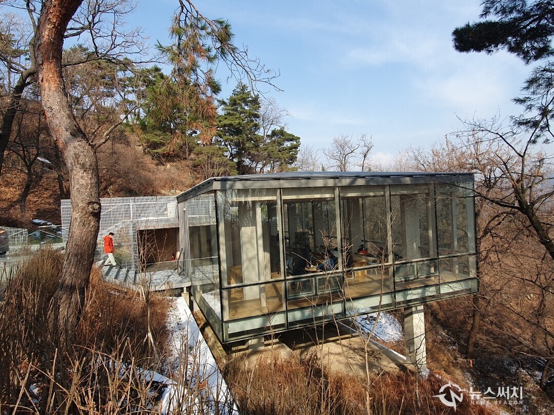인왕산 숲속쉼터. 인왕산 중턱 등산로 바로 옆에 ‘인왕산 숲속쉼터’라는 사각 유리창으로 만들어진 쉼터 건물이 있다. 이곳은 원래 옛 ‘인왕3분초’ 자리로 2018년 인왕산 군 경계병력이 거주하던 철근콘크리트 필로티구조 위 상부 구조물인 판넬을 철거하고 사면 전면을 모두 유리창으로 다시 만든 것이다. 숲 속 한가운데 있는 편안한 별장 분위기를 자아내고 있으며, 서울시 건축상 우수상과 대한민국 목조건축대전에서 대상을 받았다고 한다. |