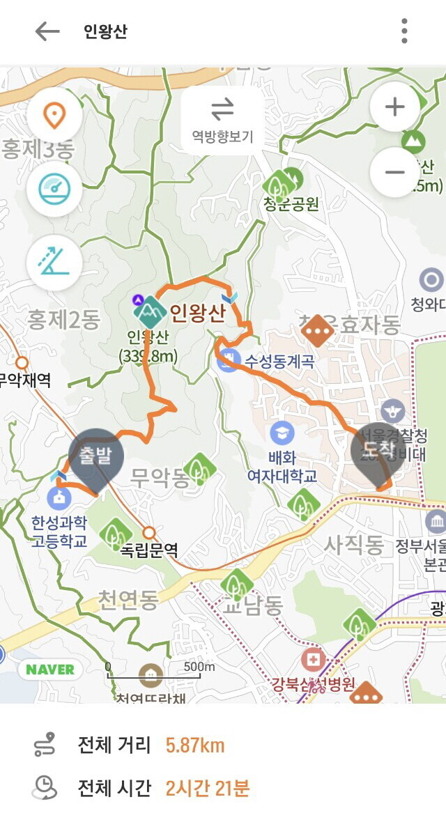 이번 인왕산 산행거리는 5.87km 였고, 산행시간은 휴식시간을 포함하여 2시간 21분이 소요되었다.