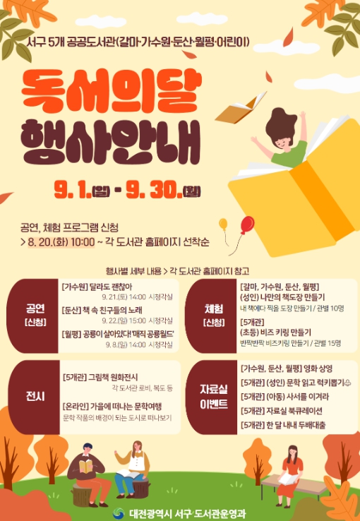 [뉴스서치] 대전 서구 5개 공공도서관(갈마·가수원·둔산·월평·어린이)은 9월 독서의 달을 맞아 공연, 전시, 자료실 이벤트 등 다양한 독서문화행사를 한 달간 운영한다고 13일 밝혔다.