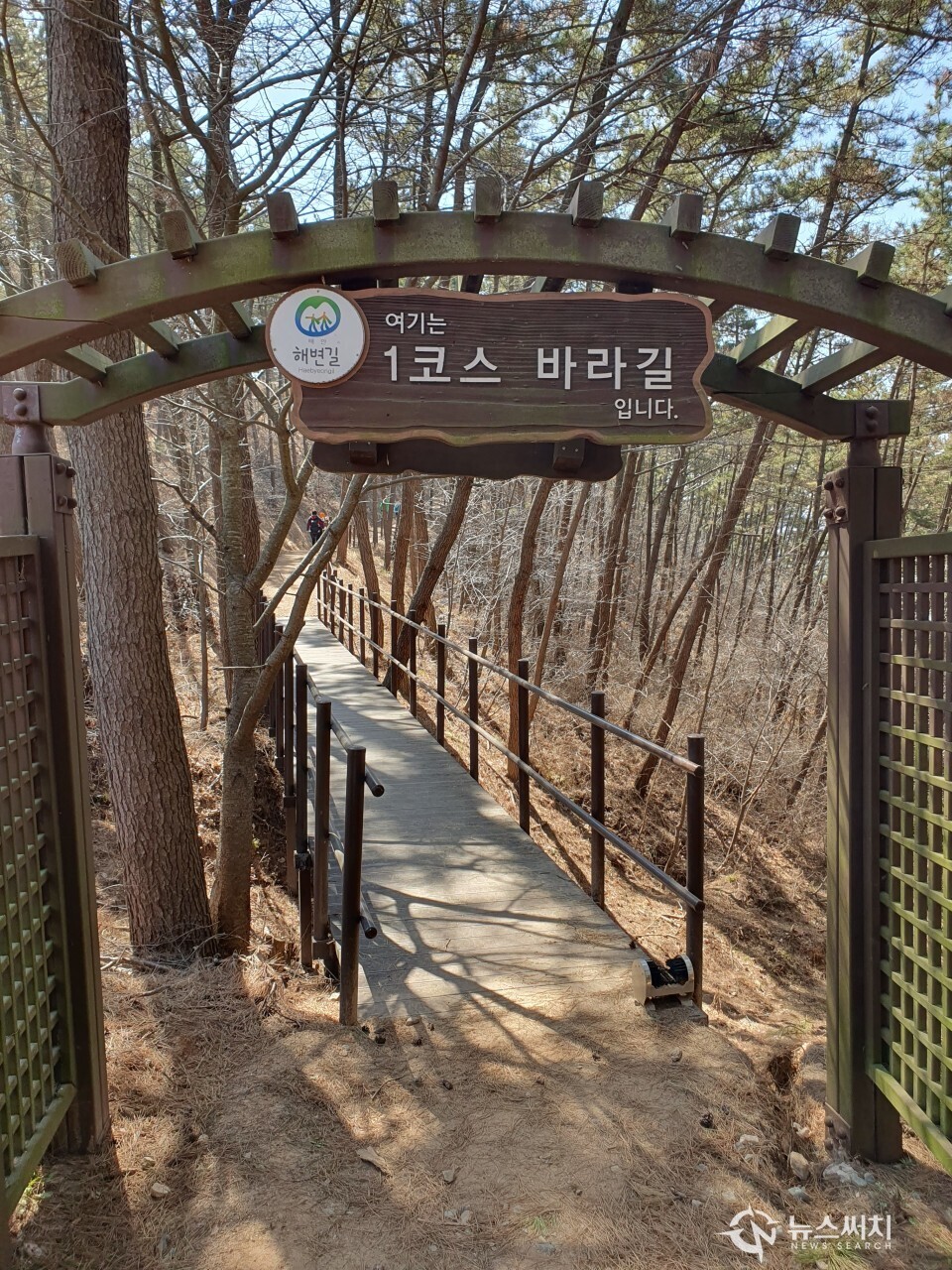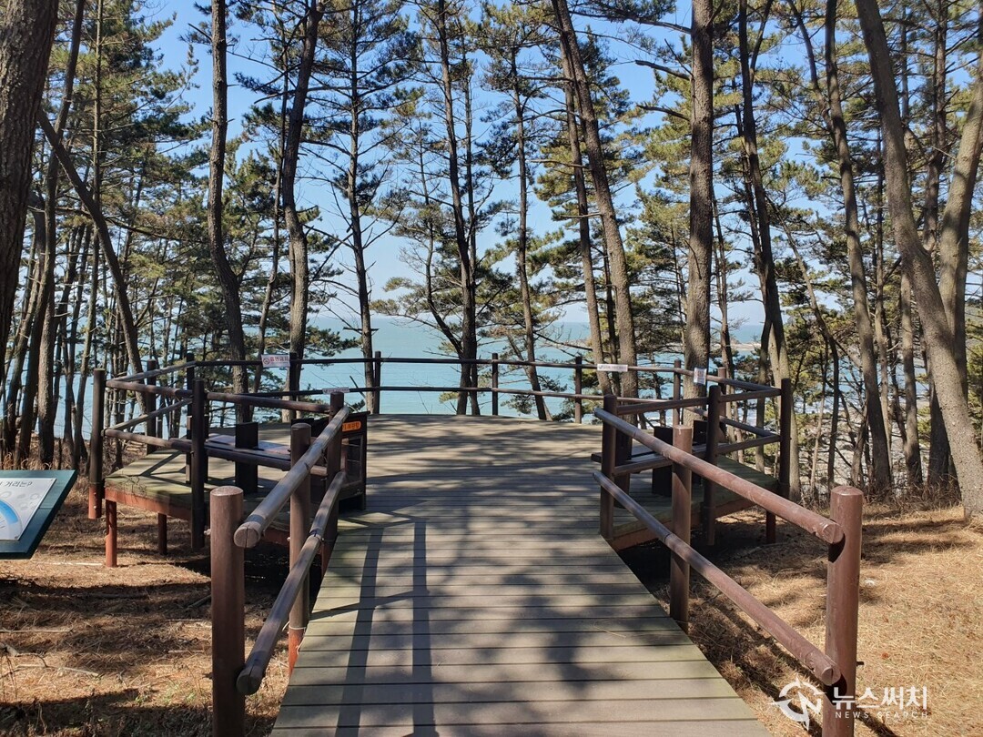 ‘능파사’를 뒤로 하고 트레킹을 계속하여 ‘양챙이’를 거쳐 나무데크로 단장된 길을 지나 해안숲길로 접어들었고 오전 11시 56분 ‘모재 쉼터’에 도착하였다. ‘모재 쉼터’는 제법 지대가 높아서 전망이 제법 괜찮았는데 기자는 쉼터에서 잠시 휴식을 취하면서 서해바다의 짠 공기를 들이마시며 예전 대학생 때 서해바다에서 느꼈던 추억을 곱씹었다.