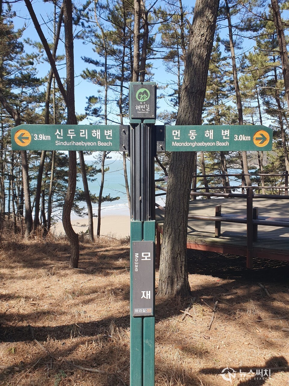 모재쉼터 앞 이정표. 태안해변길 1코스에는 신두리해변 못 미쳐 ‘모재쉼터’가 있다. ‘모재쉼터’ 앞에는 이정표가 있는데 북쪽방향으로 3.0km 거리에 ‘먼동해변’이 있고, 남쪽방향으로 3.9km 거리에 신두리해변이 있다는 것을 알려주고 있다.