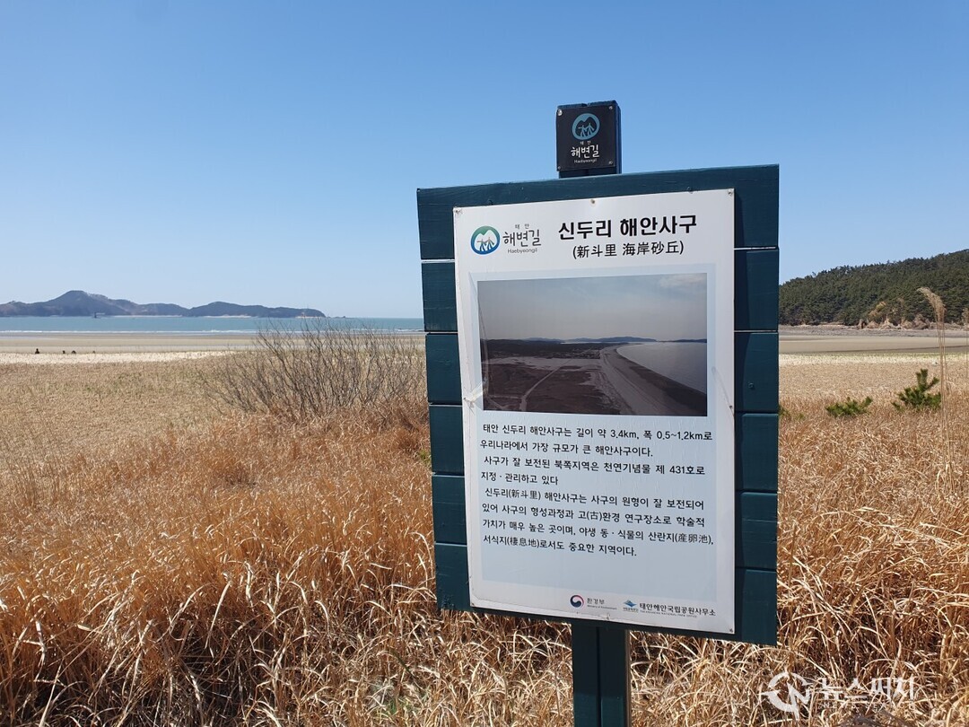 ‘모재 쉼터’에서 숲을 지나 내려가면 바도 ‘신두리해변’이다. 이제 목적지에 다 왔다고 생각할 수도 있으나 신두리해변 시작지점에서 종착지인 신두리해수욕장 끝부분까지는 거리가 약 3.4km 정도 되며, 가도 가도 끝이 없는 모래사장이 넓게 펼쳐져 있다.