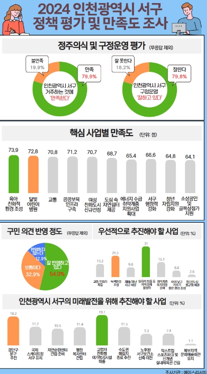 그 결과 인천광역시 서구에 거주하는 것에 ‘만족한다’라는 답변이 79.9%를 차지했으며, 서구의 핵심 사업에 대한 종합 평균 만족도는 66.3%(100점 만점으로 환산했을때 68.9점)로 만족스러운 수준으로 나타났다.