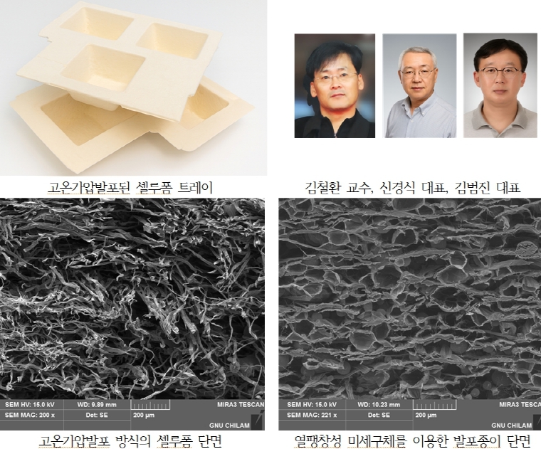 [뉴스서치] 경상국립대학교 농업생명과학대 환경재료과학과 김철환 교수 연구팀은 셀룰로오스 섬유, 전분, 열팽창성 미세구체, 계면활성제 등을 조합해 고온가압발포 방식으로 제조하는 친환경 발포 포장재 ‘셀루폼(Cellufoam)’ 개발에 성공했다.