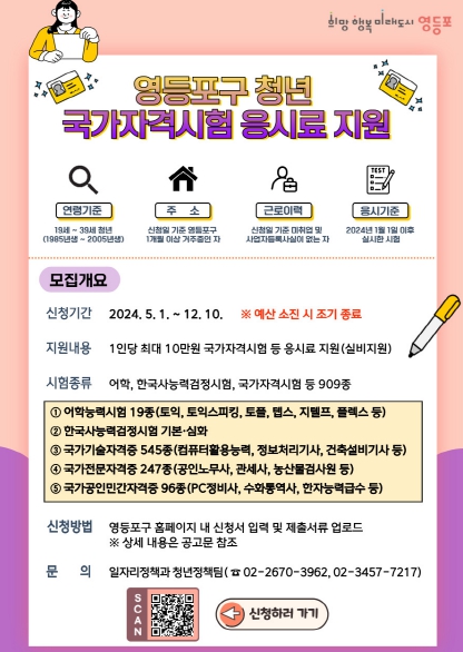 이러한 취업 준비 청년들의 자기능력 계발 의욕을 고취하고, 새로운 도전을 응원하고자 구는 올해 새롭게 ‘어학‧국가자격시험 응시료 지원’을 실시한다. 영등포구민의 34%에 달하는 청년층에게 동등한 취업 기회를 제공하고 희망찬 미래를 응원하기 위함이다.