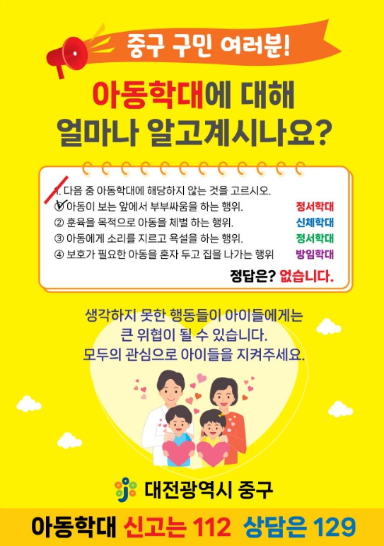 한편, 중구는 이 외에도 지방세 고지서를 통한 아동학대 예방사업과 찾아가는 아동학대 예방교육 등 아동학대에 대한 인식의 개선을 위해 지속적으로 노력하고 있다.