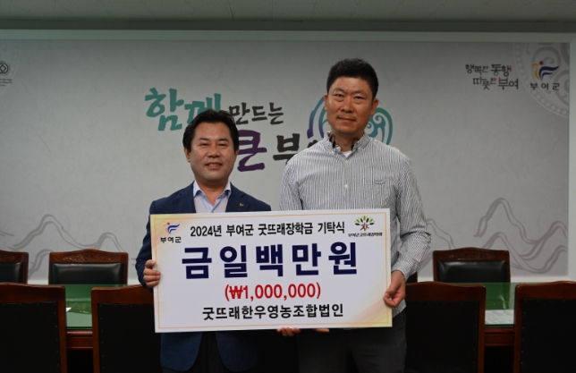 ▲ 굿뜨래한우영농조합법인, 부여군굿뜨래장학회 장학금 100만원 기탁 |