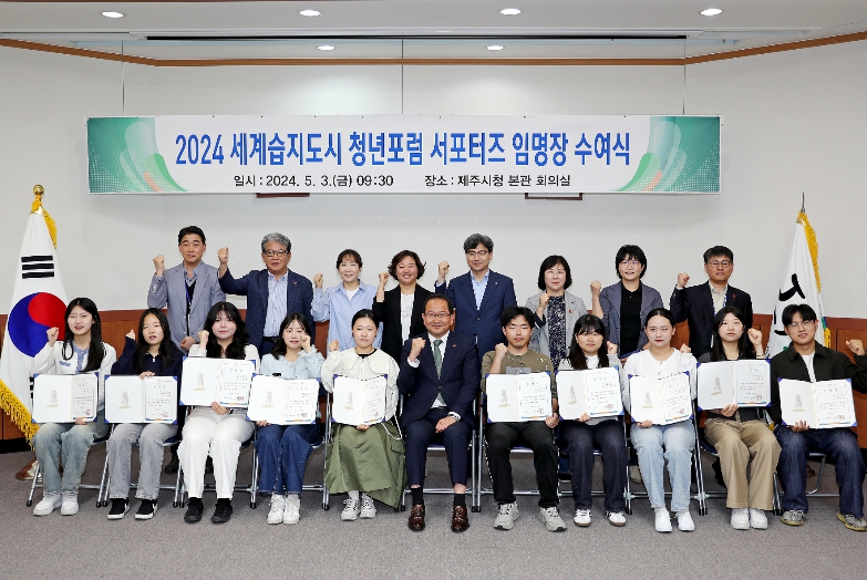 [뉴스서치] 강병삼 제주시장은 5월 3일 시청 본관 회의실에서 ‘2024 세계습지도시 청년포럼’ 서포터즈에게 임명장을 수여했다.