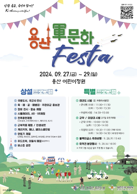 우리 국민이 군(軍) 문화를 체험할 수 있는 행사로는 9월 27일부터 29일까지 용산에서 군 문화 페스타가 용산 어린이정원에서 진행된다.