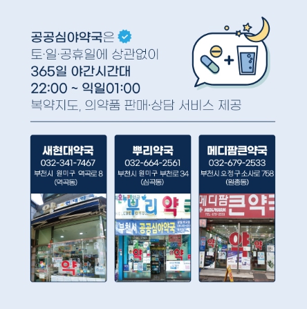 부천시에서 운영하는 공공심야약국은 역곡동 ‘새현대약국’, 심곡동 ‘뿌리약국’, 원종동 ‘메디팜큰약국’으로 총 3곳이다.