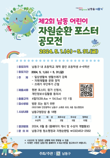 [뉴스서치] 인천시 남동구는 자라나는 어린이를 대상으로 자원순환의 중요성을 널리 알리기 위해 오는 31일까지 ‘제2회 남동 어린이 자원순환 포스터 공모전’을 개최한다고 밝혔다.