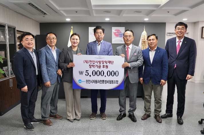 [뉴스서치] 천안시자동차전문정비협동조합(이사장 권진우)이 21일 지역인재 육성과 도움이 필요한 학생을 위해 장학금 500만 원을 천안사랑장학재단(이사장 박상돈)에 기탁했다.