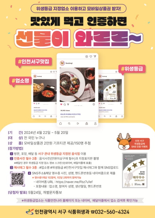[뉴스서치] 인천 서구는 ‘음식점 위생등급제’를 홍보하고 위생등급 우수업소로 지정된 음식점의 이용을 장려하기 위해 4월 22일부터 5월 20일까지 소셜미디어(SNS) 인증 이벤트를 실시한다고 밝혔다.