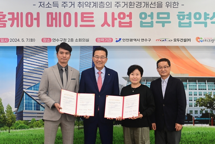 이번 협약으로 모두건설㈜·㈜크린웰은 연수구와 ‘홈케어 메이트 사업’에 협력해 저소득 주거 취약계층을 대상 ▲세면대‧싱크대 수전 교체, ▲콘센트 교체, ▲현관 방충망 설치 등 부분 집수리와 청소·방역·소독을 지원한다.